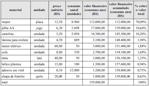Com base na tabela acima, que apresenta itens de matérias-primas em estoque de uma fábrica de aeromodelos, julgue os próximos itens