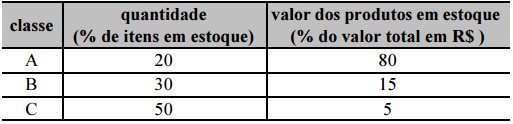 produtos em estoque de acordo com a classificação ABC, e que
