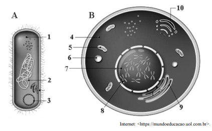 Considerando os esquemas A e B da figura apresentada e as principais características das células procarióticas e eucarióticas, julgue os itens a seguir.