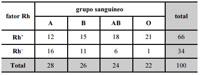 A pessoa que possua sangue classificado como AB+ é considerada receptora universal pelo fato de poder receber, em tese, sangue proveniente de doador de qualquer tipo sanguíneo. Dentro de um mesmo grupo sanguíneo, os de fator Rh– podem doar aos de fator Rh+ . O sangue O+ pode ser doado para qualquer pessoa que possua sangue com fator Rh+ . A tabela abaixo apresenta a distribuição do tipo sanguíneo e do fator Rh de membros de uma corporação.