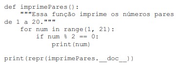 A execução desse código imprimirá a docstring da função 𝚒𝚖𝚙𝚛𝚒𝚖𝚎𝙿𝚊𝚛𝚎𝚜(), apresentada a seguir.