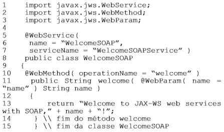 Com relação a esse código do serviço web WelcomeSOAP, julgue