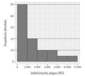 Considerando que, no histograma apresentado, os dados estão agrupados em intervalos de classe, julgue o item que se segue, a respeito da distribuição das indenizações pagas.