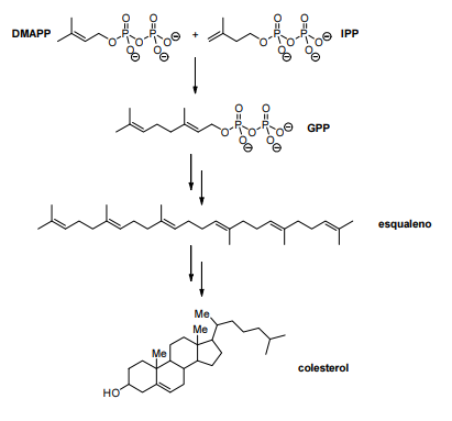 O processo de biossíntese do colesterol inicia-se na reação entre dimetilalilpirofosfato (DMAPP) e isopentenilpirofosfato (IPP). O produto dessa reação é o geranilpirofosfato (GPP) que, além de conduzir à síntese de colesterol, por meio da formação de esqualeno, também origina a vasta classe dos terpenos. Com relação às reações envolvidas na síntese do colesterol e às estruturas químicas dos compostos relacionados descritas na figura acima, julgue o item a seguir.