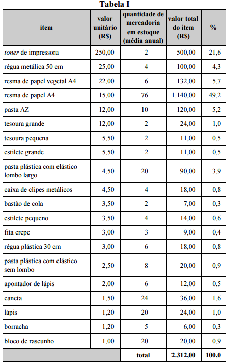 Matéria/Assunto: Administração > Administração de Recursos Materiais / Gestão de estoques